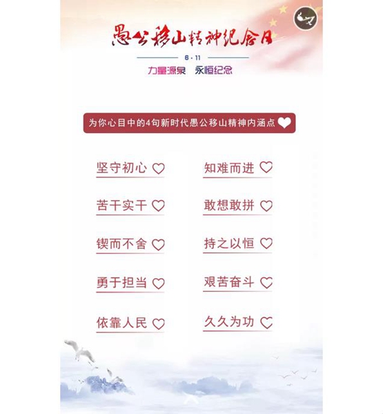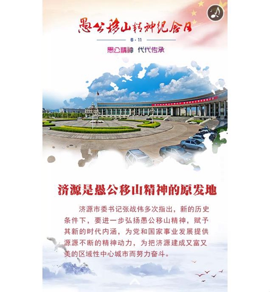 愚公移山精神是中華民族的寶貴精神財(cái)富,是黨和人民事業(yè)永續(xù)發(fā)展的力量源泉,受到黨和國(guó)家領(lǐng)導(dǎo)人的高度重視,成為中國(guó)精神、民族精神的代表。2017年濟(jì)源將每年的6月11日設(shè)立為“愚公移山精神紀(jì)念日”,旨在線(xiàn)進(jìn)一步傳承中華民族精神。